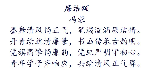 创作理念:此诗以“廉洁”为主题,通过描绘清风正气、墨香丹青等元素,展现了廉洁文化的深厚底蕴和鲜明特色。诗中“清风徐来”象征着廉洁之风的吹拂,“墨香四溢”则寓意着廉洁文化的传承与创新。整首诗呼吁人们拒腐崇廉,传承美德,共同营造清风正气的社会氛围。