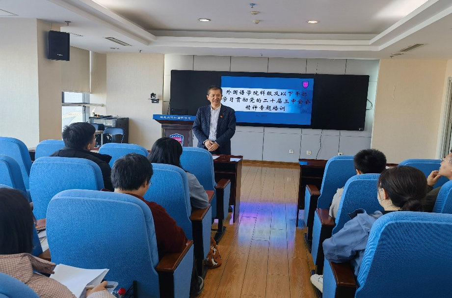 11月21日,六间房 在主楼1008室举办科级以下干部学习贯彻党的二十届三中全会精神教育培训开班仪式暨第一次全体学习。学院机关全体人员参加培训,机关党支部书记张立夫主持开班仪式。