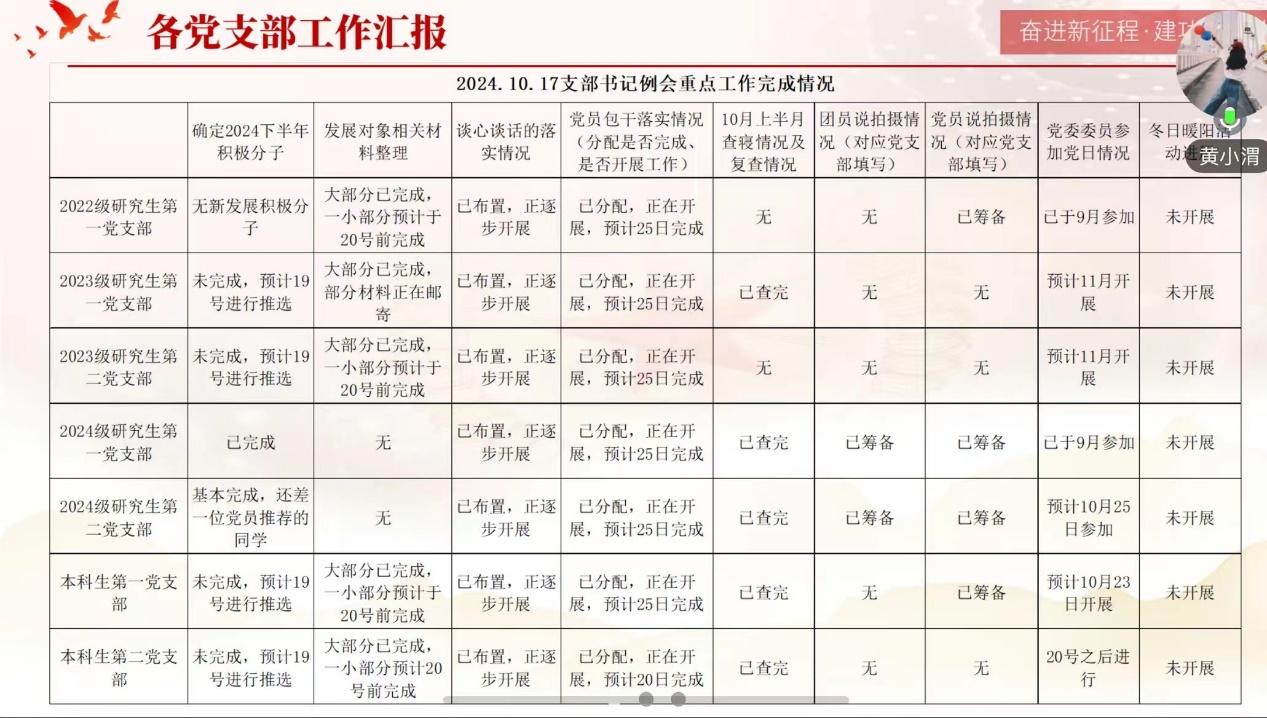 随后,各学生党支部书记结合近期的重点工作开展情况、当前支部中存在的具体问题、困难以及未来的工作思路逐一进行了汇报。鄂立华老师结合学校要求的相关理论学习内容、全年党员活动计划及各支部工作具体开展情况,布置了未来两周的重点工作及有关要求,强调各支部在开展工作期间要严格遵守相关程序规定,不断提高工作的规范性。
