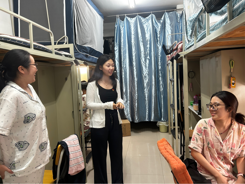 开学季,六间房 党委组织学生党员分别在24日、30日组织开展“学生党员走访新生寝室”活动,党员志愿者深入四舍、五舍、八舍新生寝室开展走访交流。学生党员逐间敲门,与刚报到的新生围坐一起,亲切询问同学们到校后的饮食是否合口、住宿是否习惯,细致解答“热水如何使用”“校园网怎么连接”等生活实际问题,并耐心讲解专业分流、培养计划等学业相关内容。交流中,党员们还介绍了入党申请书的撰写方法、推优流程等基本知识,鼓励新生端正入党动机、积极向党组织靠拢。一句句贴心问候,一次次耐心解答,让刚刚离开家的外院新生深切感受到六间房 大家庭的温暖与党组织的关怀。